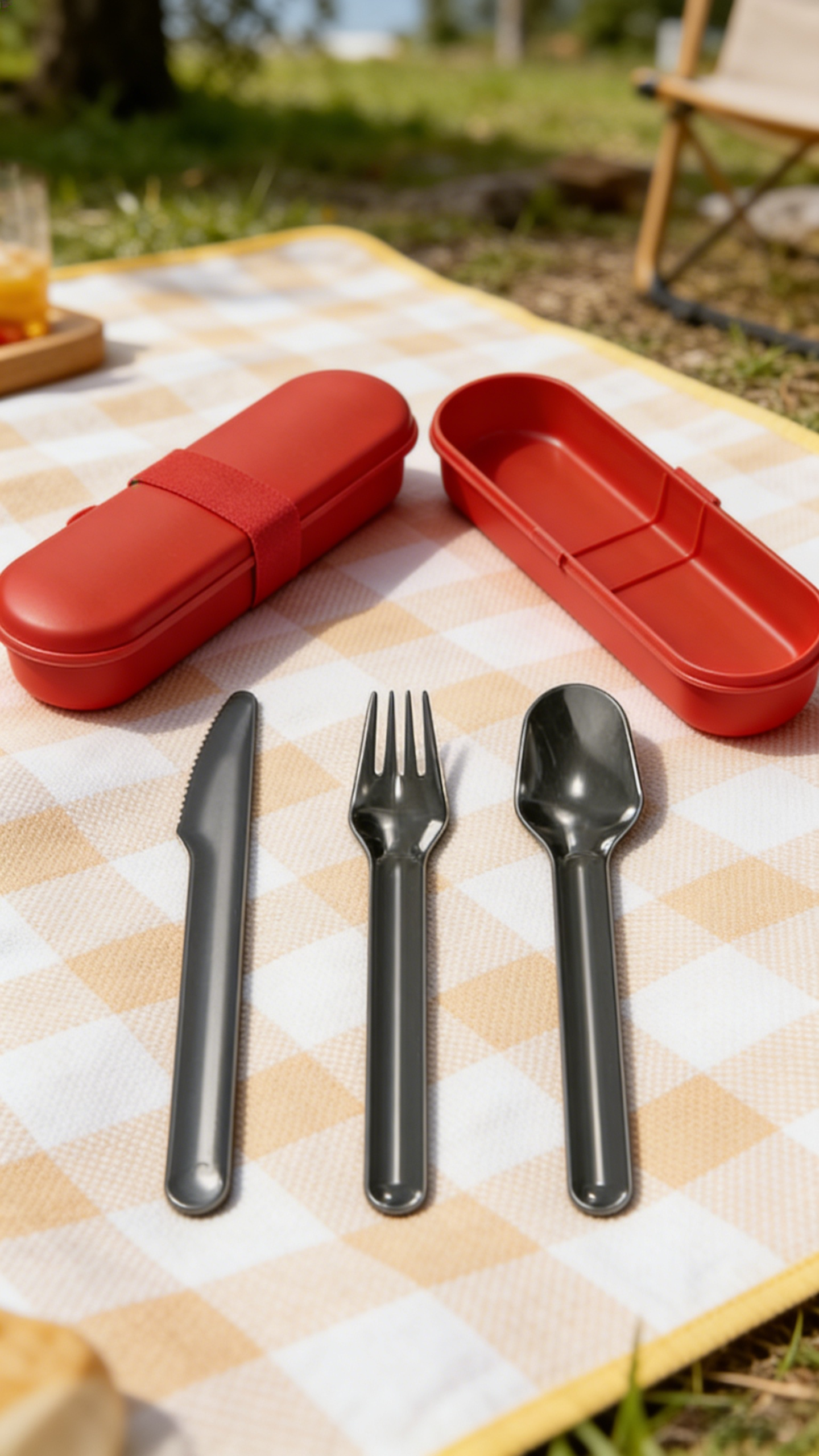 Portable 3-piece cutlery set with a durable travel case, ideal for on-the-go meals, picnics, and eco-friendly dining.