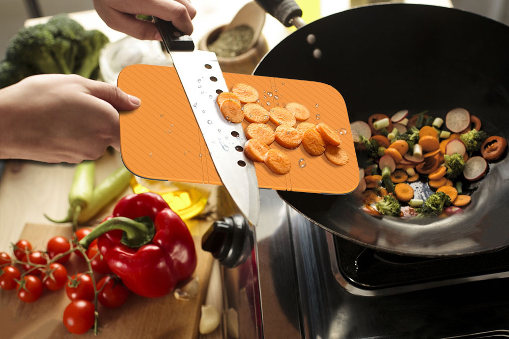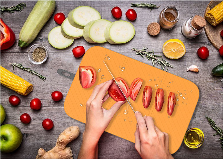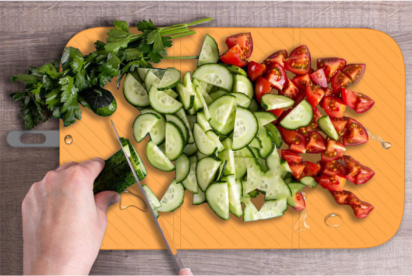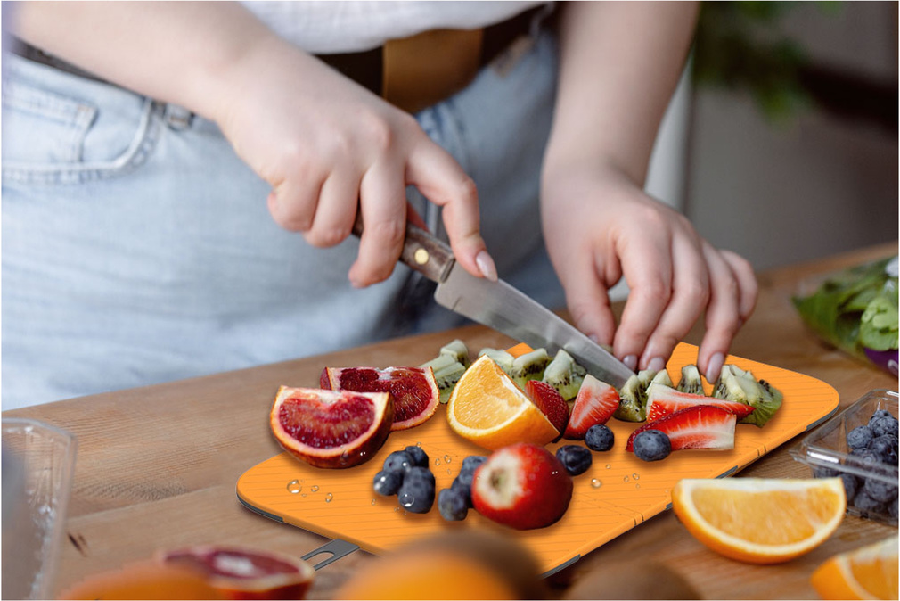 An innovative foldable cutting board with a sleek, practical design—unfolds for full-size chopping and folds into a compact shape to maximize space savings.