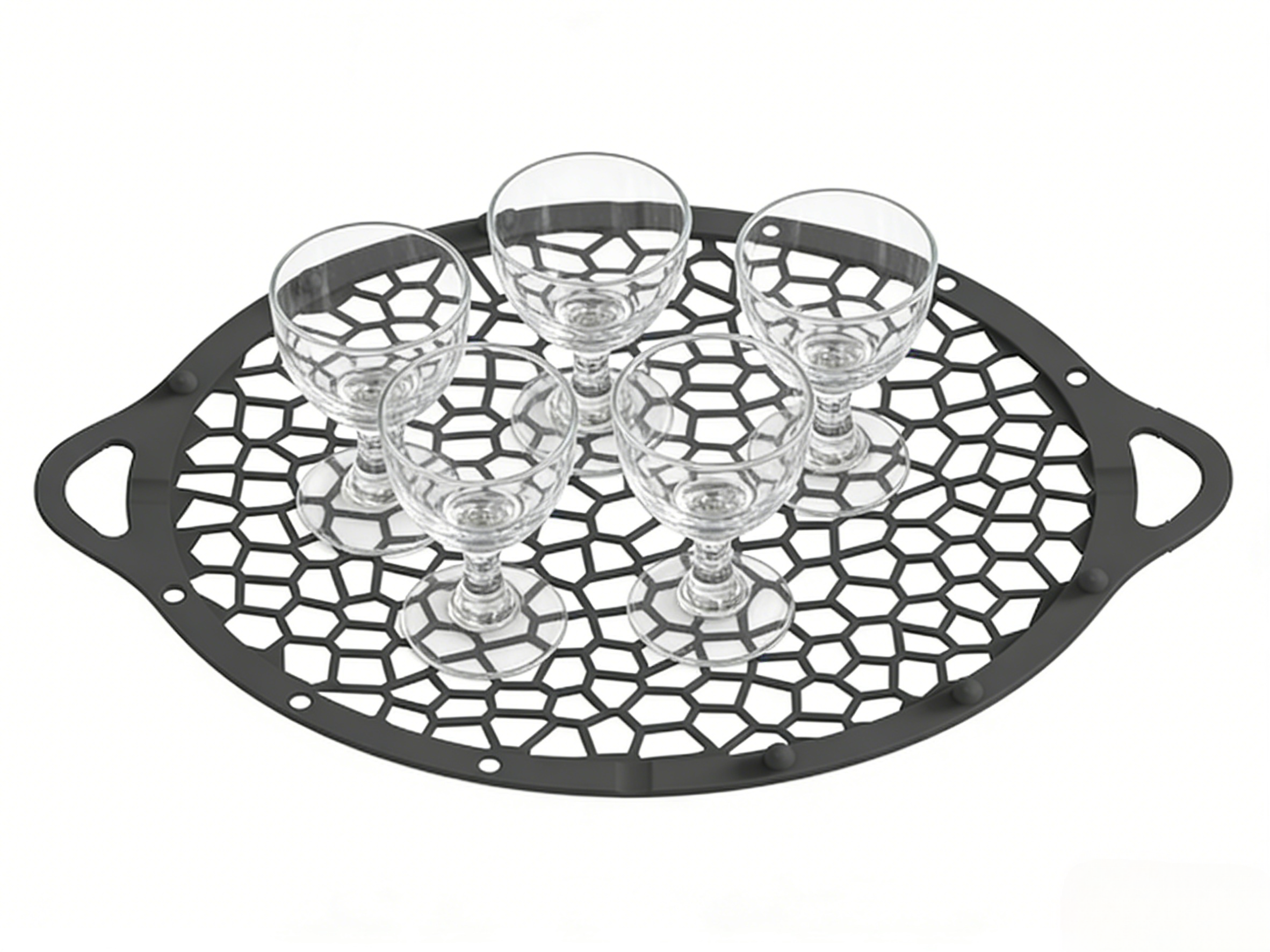 This round mesh boiling bag features a striking black geometric net design, with a sleek circular shape and integrated handles, creating a modern and functional look in the kitchen.