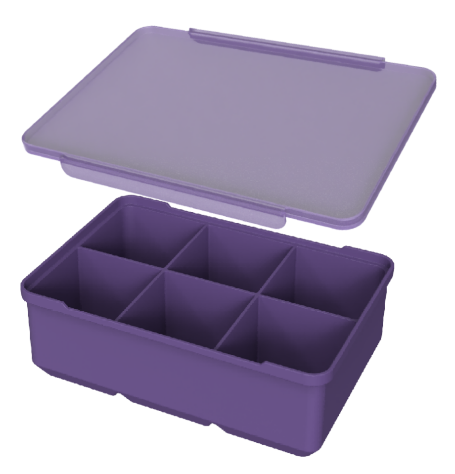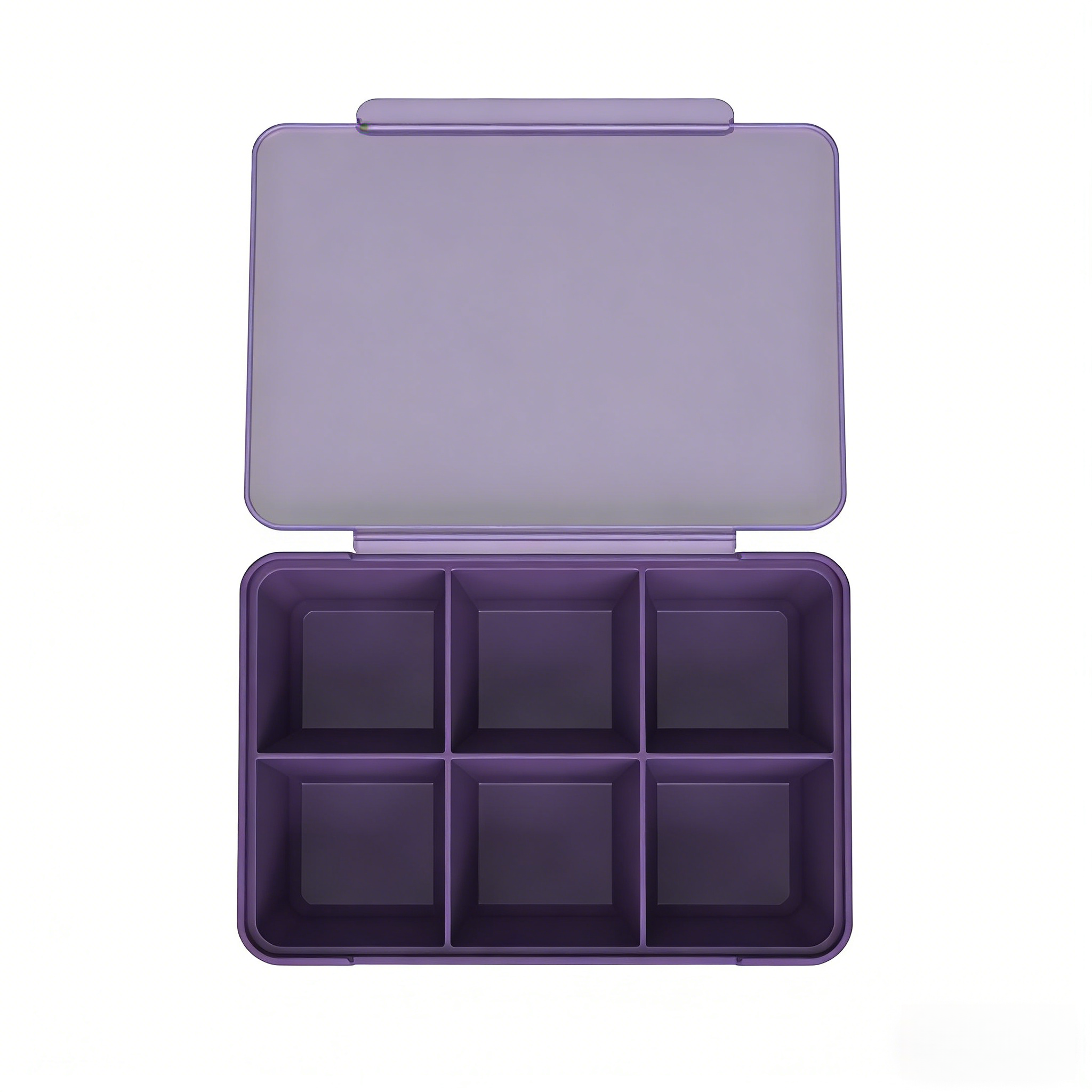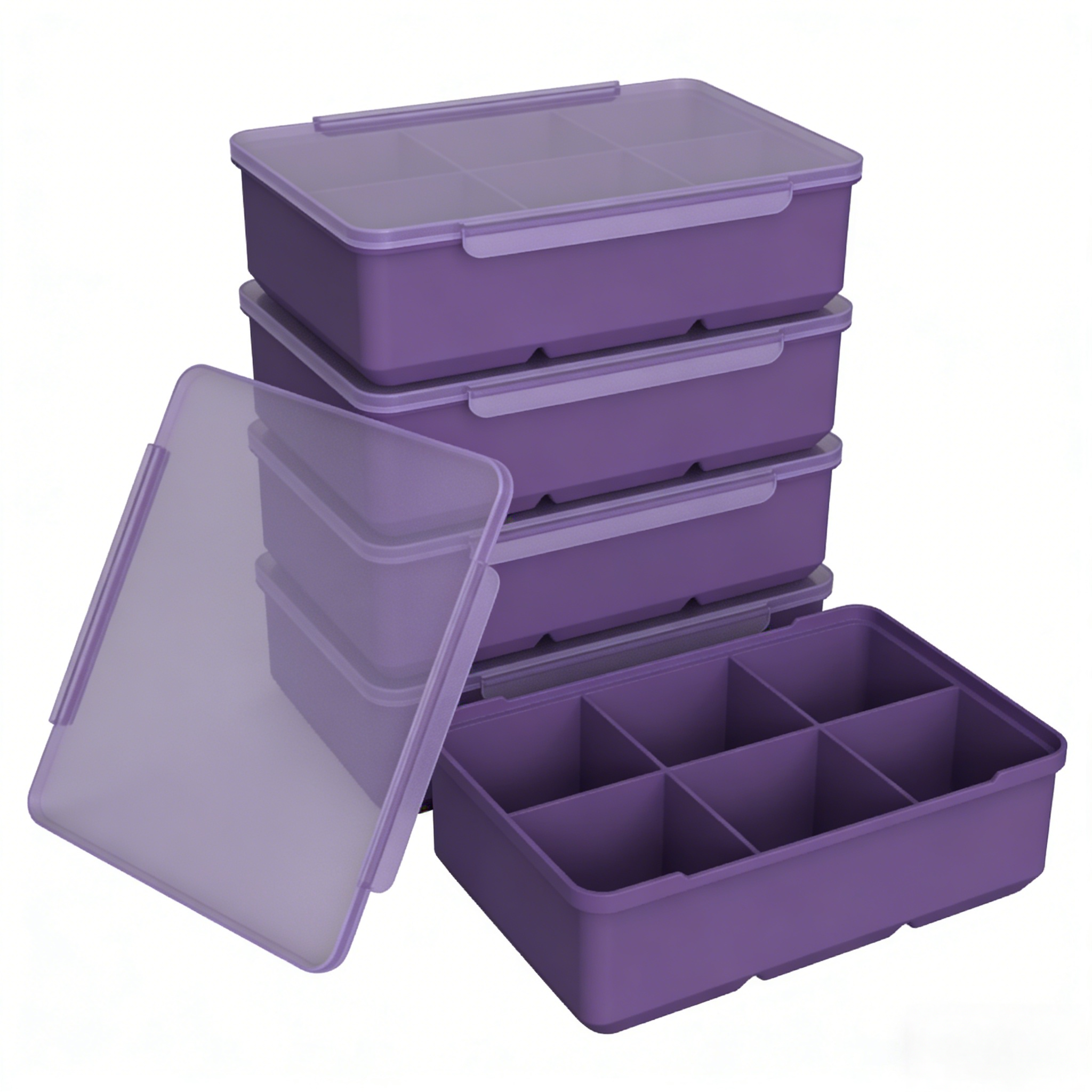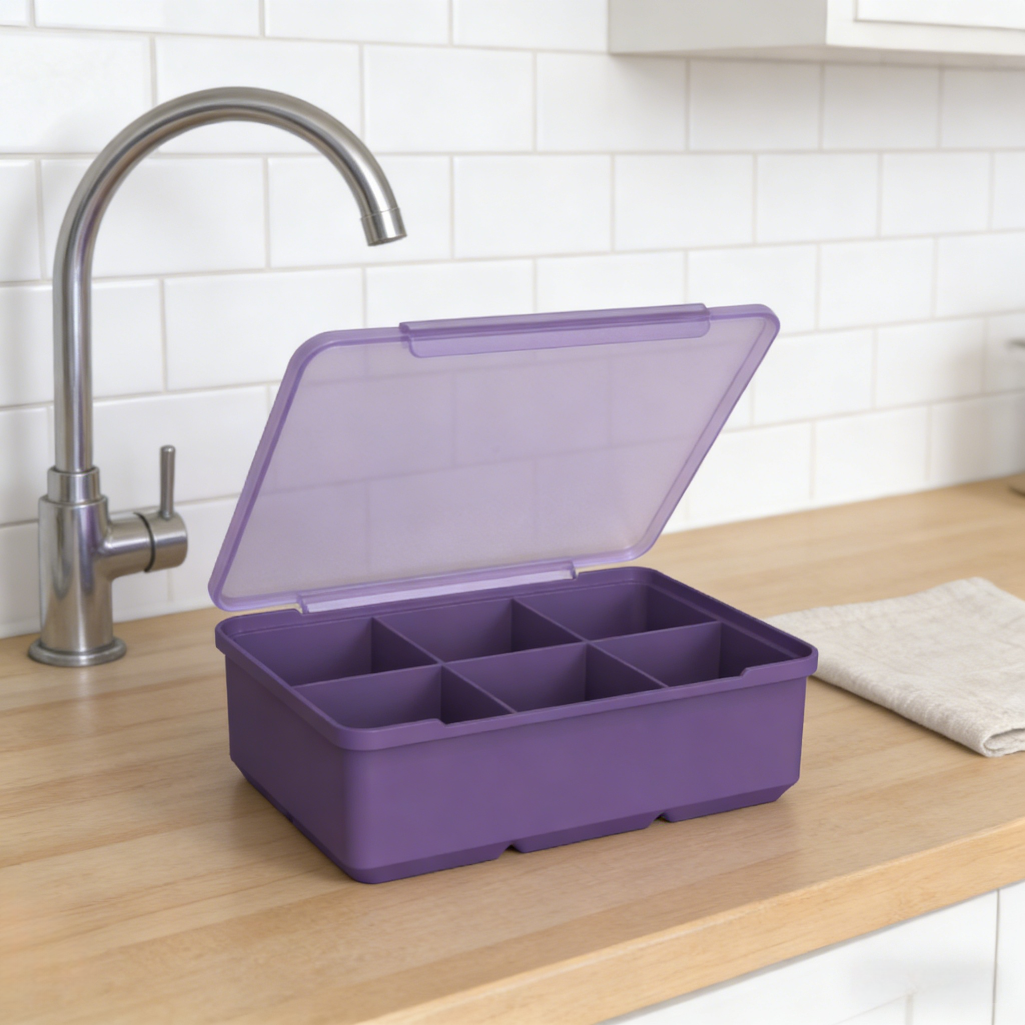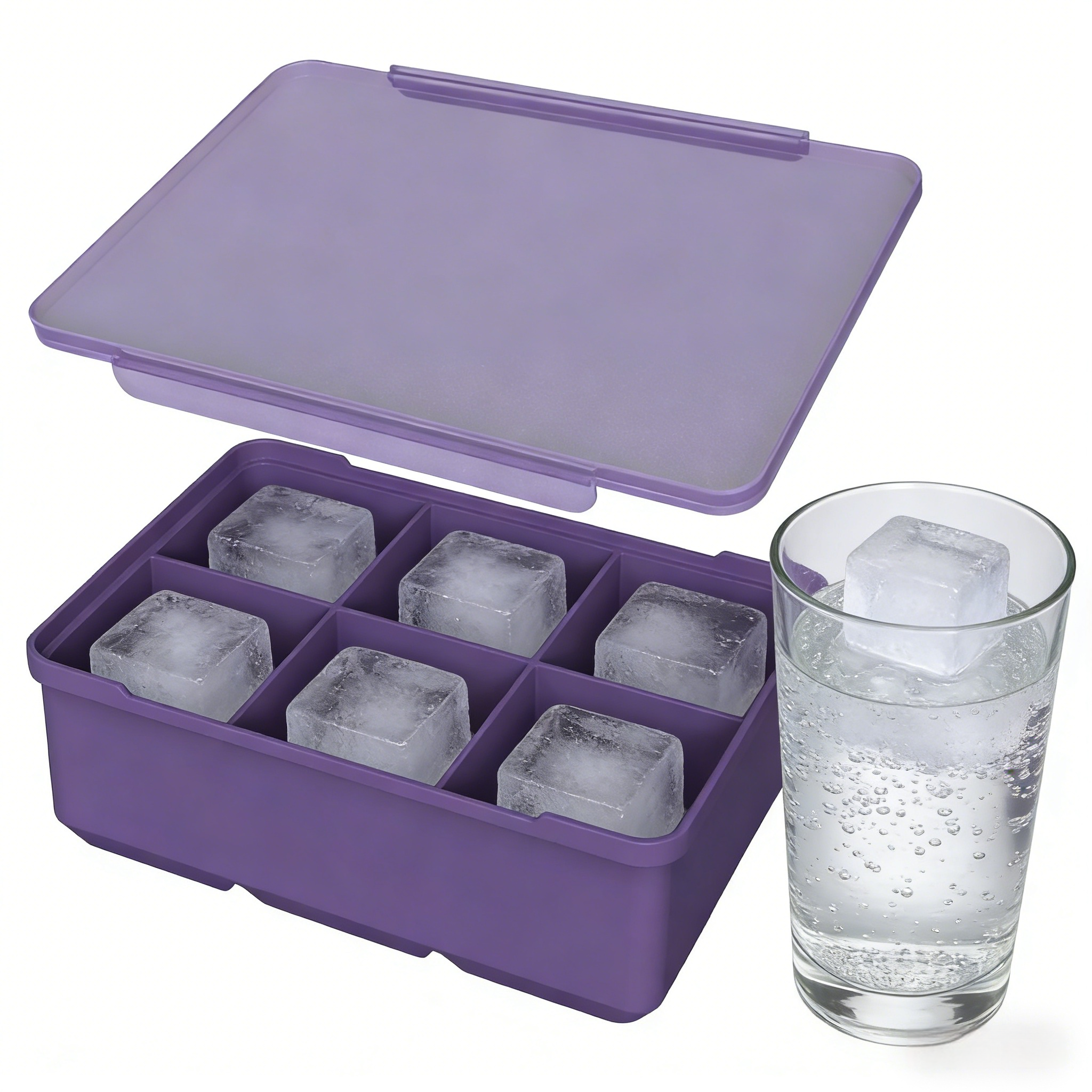 This silicone ice cube tray features a smooth matte purple body, paired with a matching translucent lid and six neatly divided compartments, creating a clean, modern, and organized appearance for your freezer.